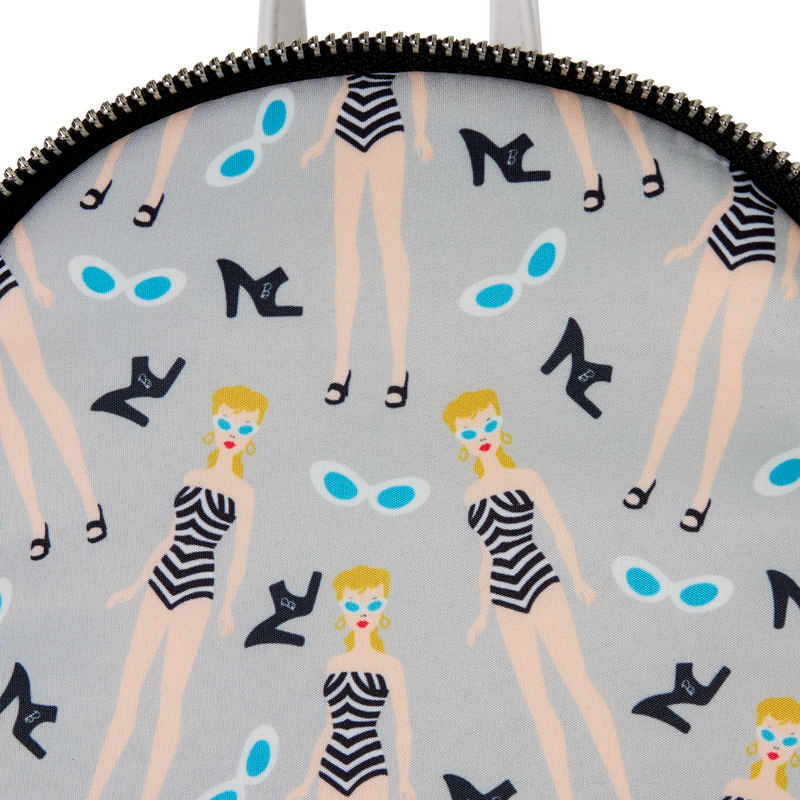 This mini backpack pays homage to Barbie’s beginnings. Barbie appears in applique form on the front wearing her classic black-and-white chevron swimsuit. Her earrings are made from real chain and golden rings. The chevron pattern continues all over the bag.