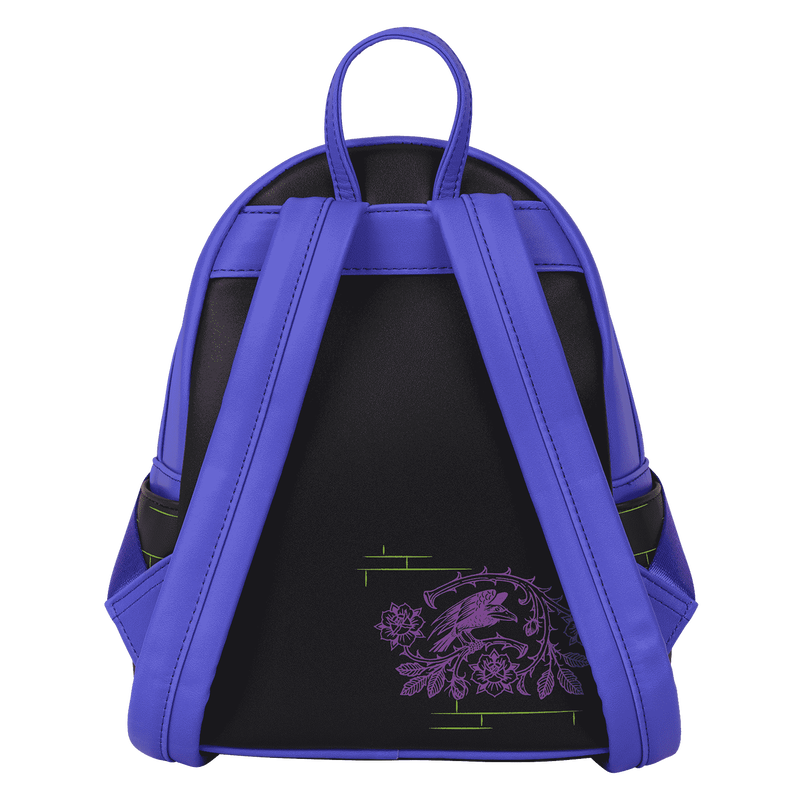 This mini backpack features some of your favorite Disney Villains in a “stained glass” window on the front of the bag. You’ll find: the Evil Queen, Dr. Facilier, Maleficent, Hades, and Cruella de Vil. Embroidered flowers bloom in the lower corners. You’ll find other motifs of these villains on the side pockets and back of the bag.